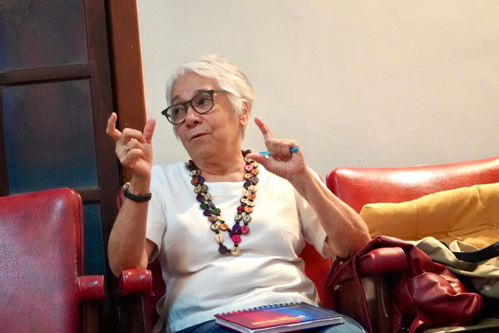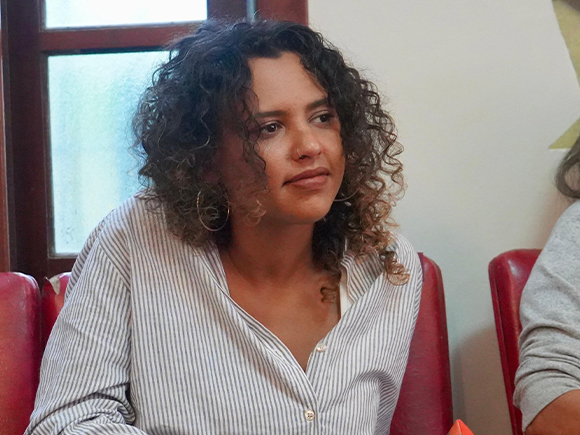 Goiana, mestranda no PPGCine-UFF, onde integra o Laboratório Kumã. Pesquisa relações entre cinema e território. Já trabalhou com crítica, curadoria e fotografia. Atua como oficineira nos projetos Cine Quilombola e Cinema de Griô do Instituto Marlin Azul. Integra a Associação Mulheres Coralinas, na cidade de Goiás. Edita, escreve e faz cartazes.